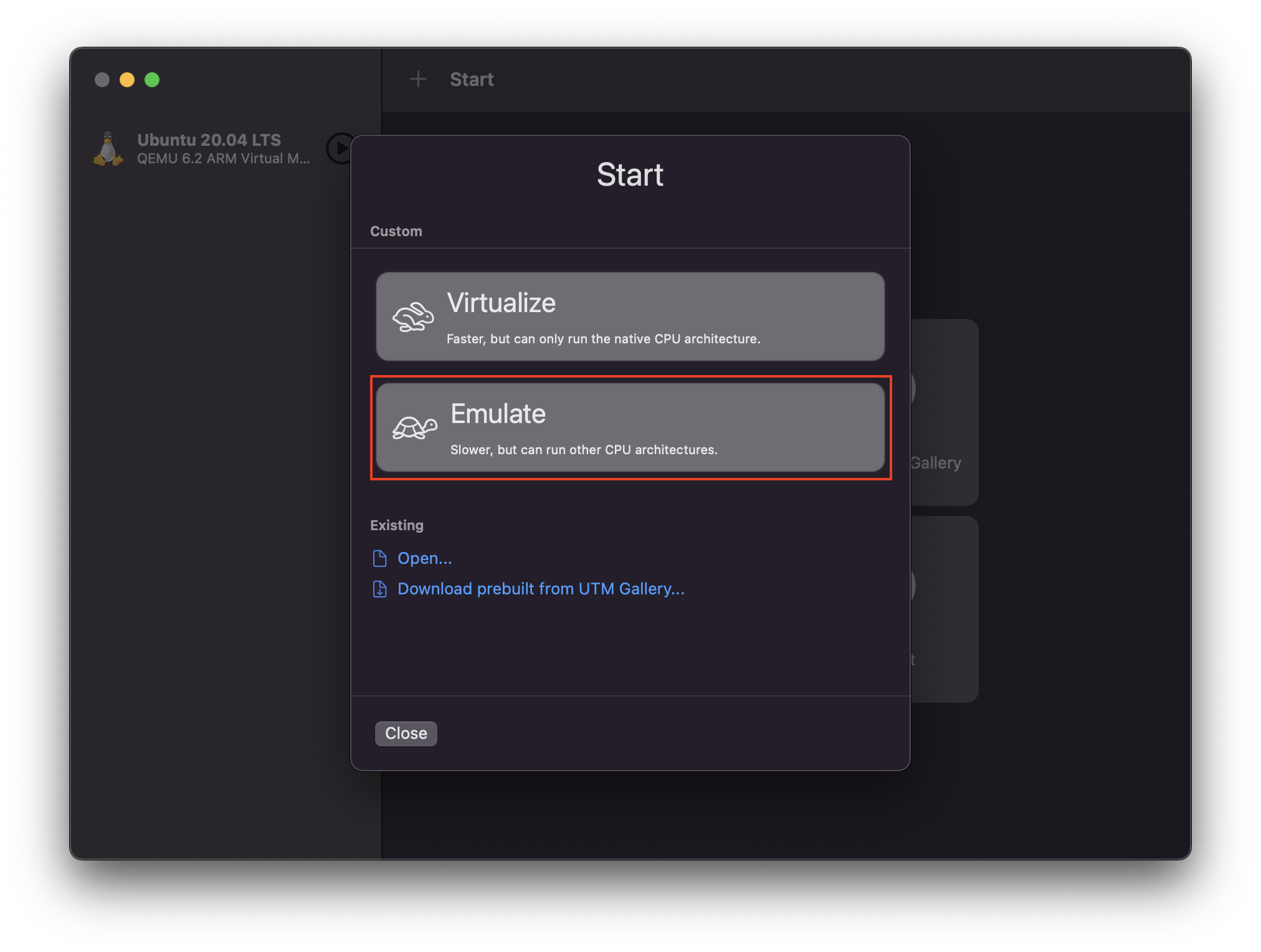 - Open UTM and click the “+” button to open the VM creation wizard.