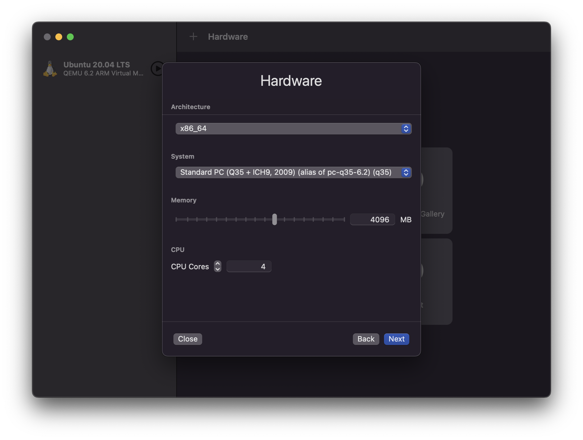 - Pick the amount of RAM and CPU cores you wish to give access to the VM. Press “Next” to continue.