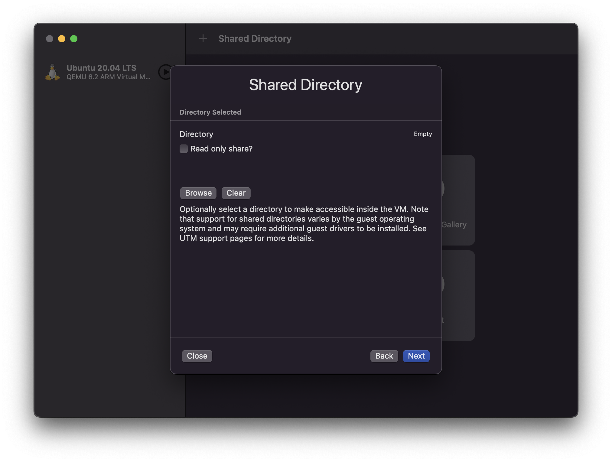 - If you have a directory you want to mount in the VM, you can select it here. Alternatively, you can skip this and select the directory later from the VM window’s toolbar. The shared directory will be available after installing SPICE tools (see below). Press “Next” to continue.