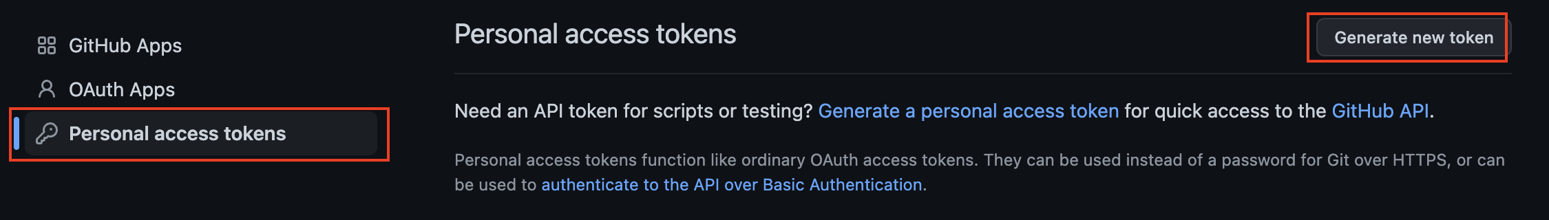 3. 좌측 사이드바의 'Personal access tokens 를 클릭하고, 우측 'Generate new token' 버튼을 클릭한다.