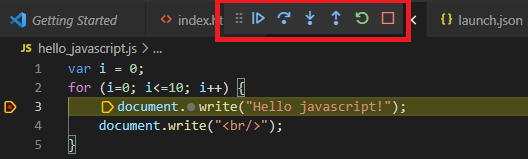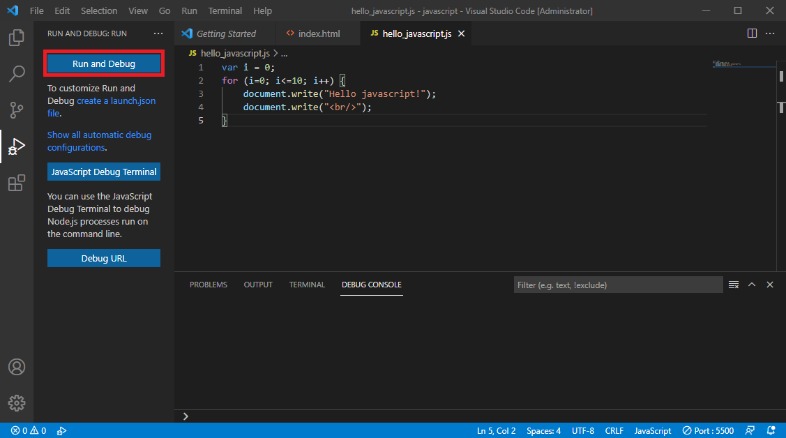 javascript 파일이 열려 있는 상태에서 [F5] 를 누르거나 Run > Start Debugging 을 선택