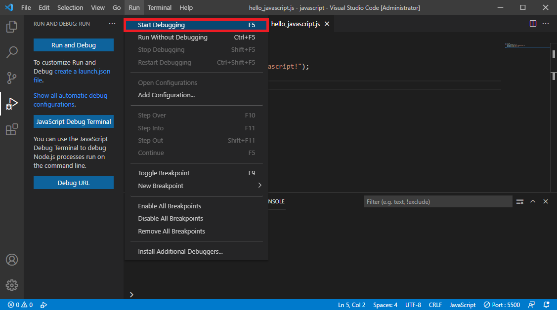 javascript 파일이 열려 있는 상태에서 [F5] 를 누르거나 Run > Start Debugging 을 선택